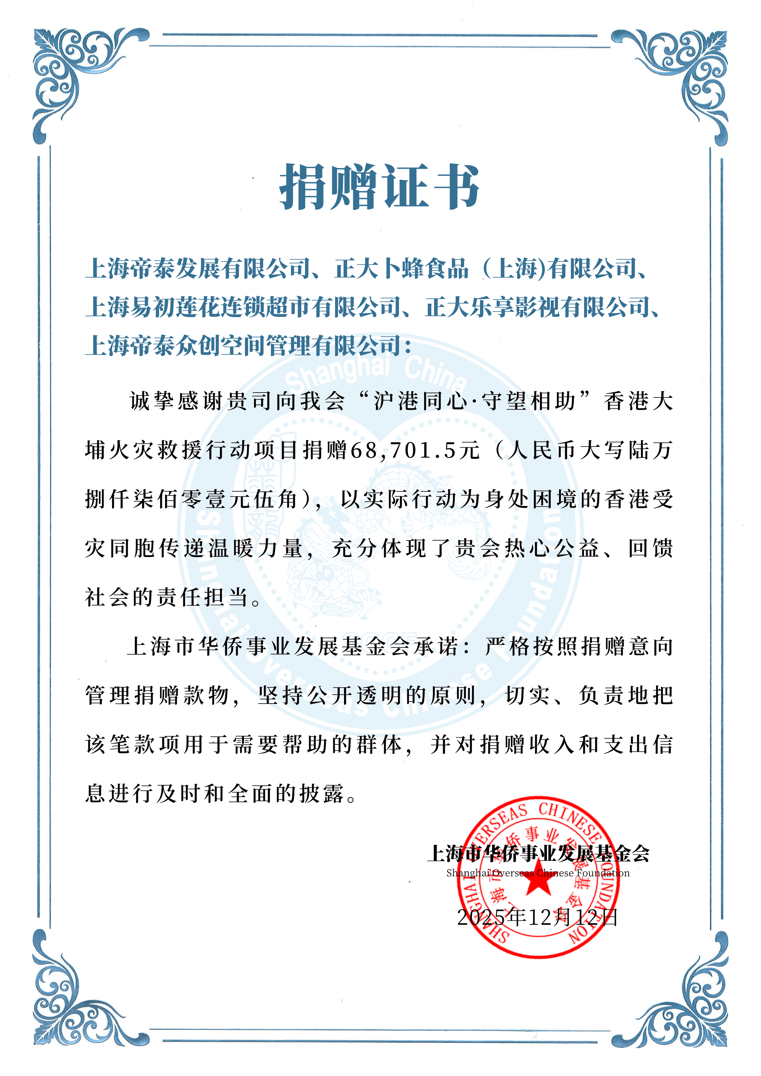 中国香港大埔宏福苑火灾造成重大人员伤亡和损失,各界迅速响应发起捐款倡议。12月5日,正大集团旗下上海帝泰发展有限公司、正大卜蜂食品(上海)有限公司、上海易初莲花连锁超市有限公司、正大乐享影视有限公司、上海帝泰众创空间管理有限公司倡议员工及合作伙伴爱心捐款,筹集善款共计人民币68,701.50元,款项已通过上海香港联会全数捐赠至上海市华侨事业发展基金会账户之“上港联慈善专项基金”,该专项基金用于香港火灾救助与灾后重建工作。