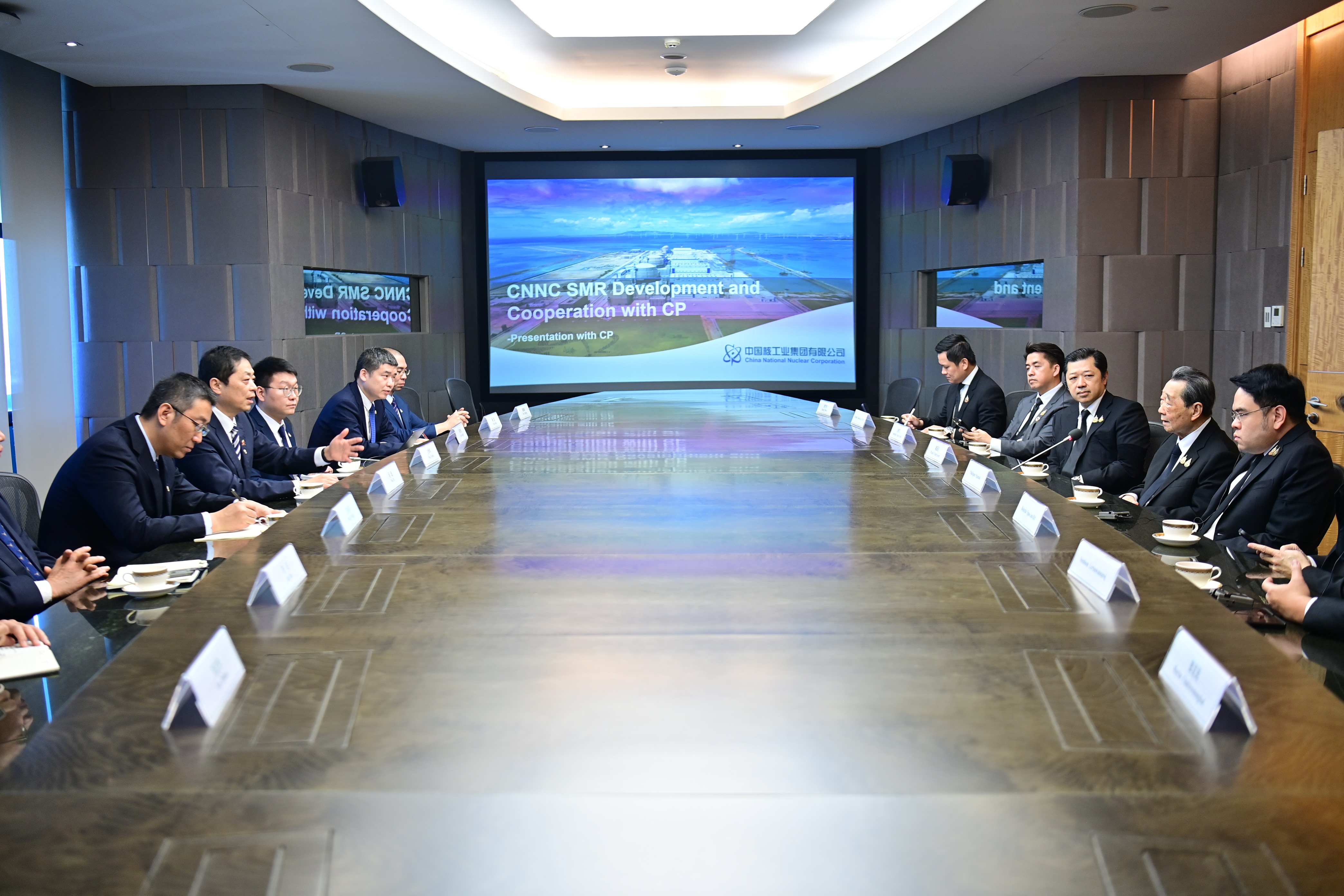 中核集团财务部副主任吴迪、财务部资金处副处长刘涛,中国中原对外工程有限公司董事长王永革,中核集团亚洲代表处副总代表、中国中原对外工程有限公司东盟区域开发总部总经理陈闽烽,中国中原对外工程有限公司财务部副主任贾岛,中核集团亚洲代表处、中国中原对外工程有限公司东盟区域开发总部泰国代表陈方俊;正大集团首席运营官谢林辉、新能源公司相关负责人等参加座谈。