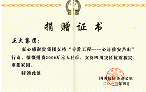 受益于中国的改革开放政策,正大集团时时不忘对祖国的深深回报,在投资企业的同时,正大集团怀着奉献爱心的情怀,重视社会公益事业的参与。10多年前,正大集团就与中央电视台合办《正大综艺》节目,为中国千家万户家庭带来欢乐,并开创了中国电视综艺节目全新的模式。 “非典”期间,正大集团向中国政府捐赠人民币1千万元。2008年汶川大地震,正大集团向四川地震灾区累计捐赠人民币3千余万元。 此外, 正大集团还无偿捐助国内外教育事业并多次捐助国内各大学和其他教育研究机构,积极扶贫救灾,取得了良好的社会效益。多年来,正大集团为中国社会公益事业累计捐款金额超5亿元人民币。