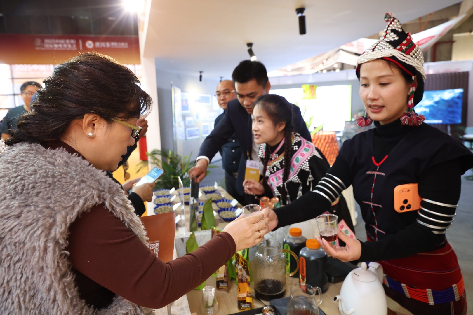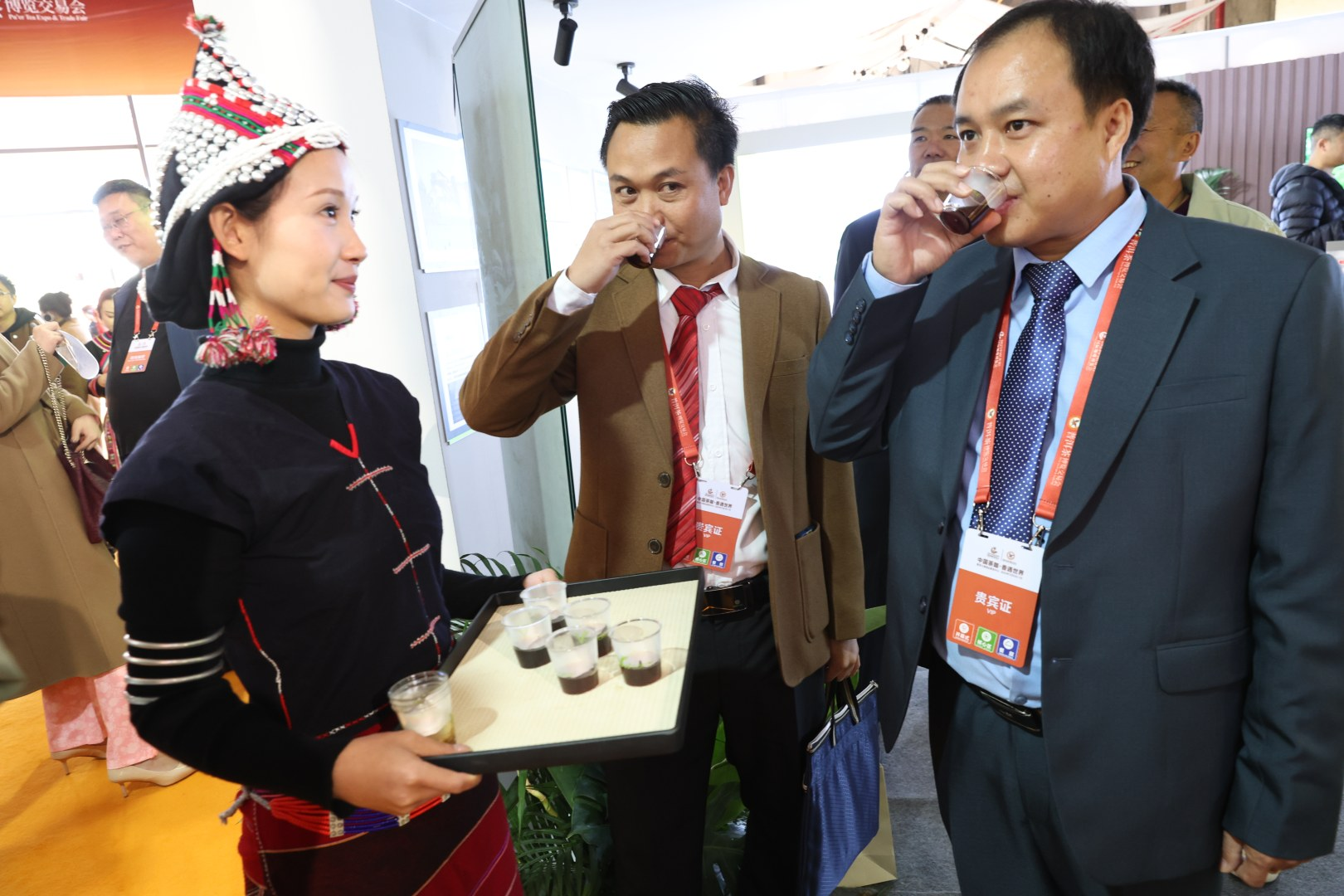 ▲老挝丰沙里省工贸厅副厅长SengLa DAOBHANG(右)、丰沙里省外事厅国际合作与礼宾处处长Santisuk LACHANPHET(中)在正大展馆品尝正大普洱咖啡。